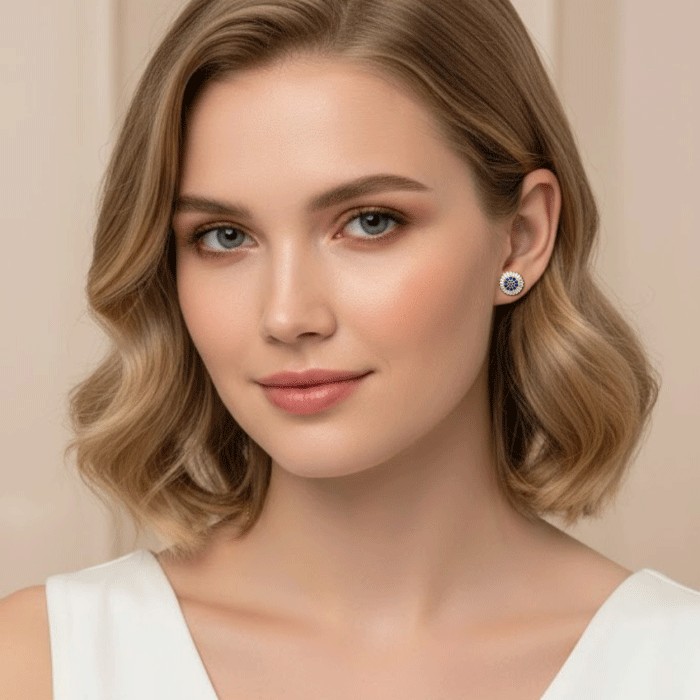Descubre la Elegancia Atemporal con nuestros Aretes Tipo Botón de Halo Radiante. Este exquisito diseño captura la luz gracias a su deslumbrante configuración: un núcleo de pequeñas gemas redondas de un profundo color azul zafiro, enmarcadas por una corona de baguettes blancos de corte rectangular que maximizan el brillo, creando el efecto de un sol radiante o una flor.