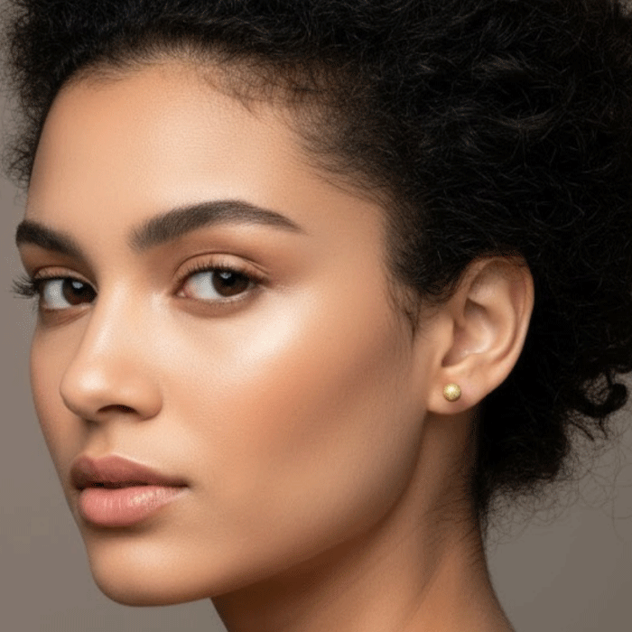 Aretes topos bañados en oro con textura mate. Diseño clásico y elegante que ilumina tu estilo con sutileza y distinción.