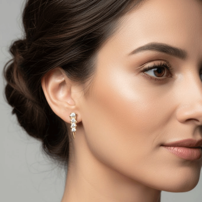 Los aretes Topos Línea de Brillo reflejan sofisticación y encanto en cada detalle de 2.8cm de alto. Su diseño vertical con cinco circones perfectamente alineados proyecta una luz deslumbrante que realza el rostro con elegancia.