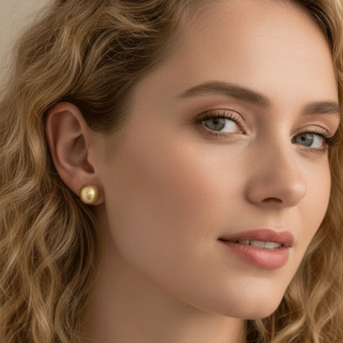 Aretes topos medianos bañados en oro con acabado satinado. Elegancia clásica y brillo sutil para cualquier ocasión.