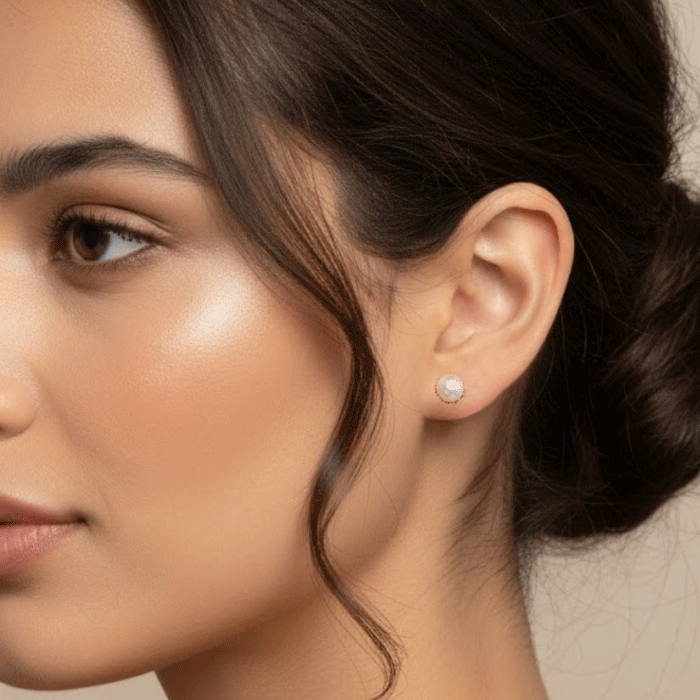 Aretes medianos bañados en oro con perla central. Diseño elegante y atemporal que realza la belleza natural con delicadeza.