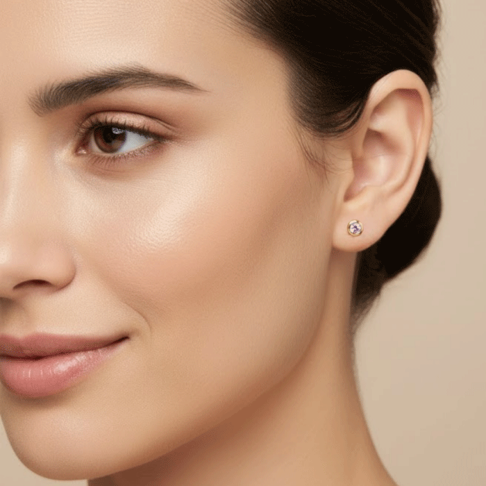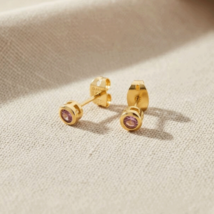 Aretes pequeños bañados en oro con circón lila. Diseño minimalista y elegante para un brillo sutil y encantador.