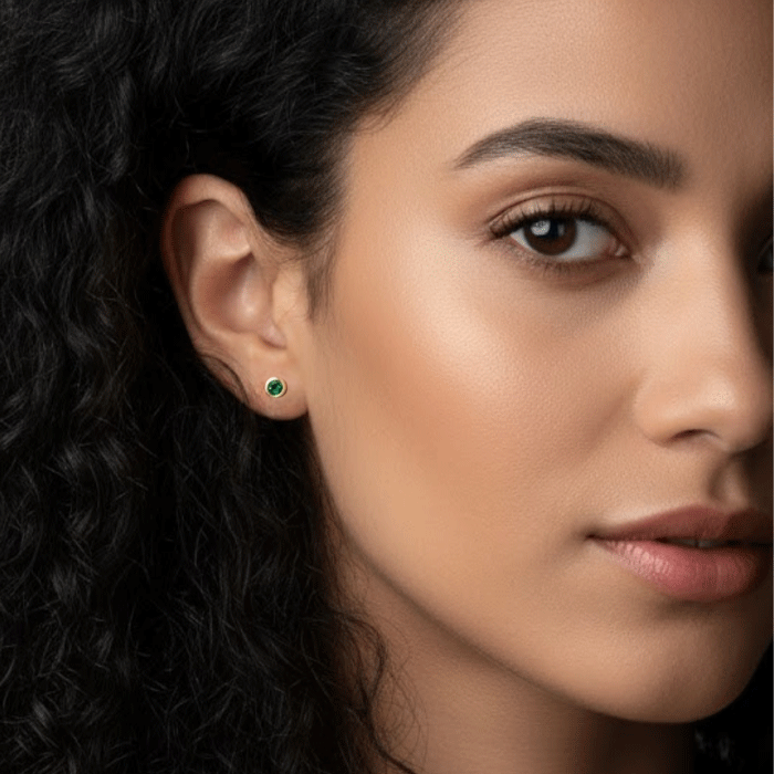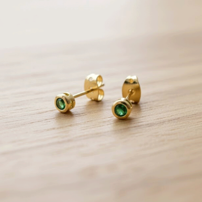 Aretes pequeños bañados en oro con circón verde. Un diseño delicado y brillante que refleja elegancia natural.