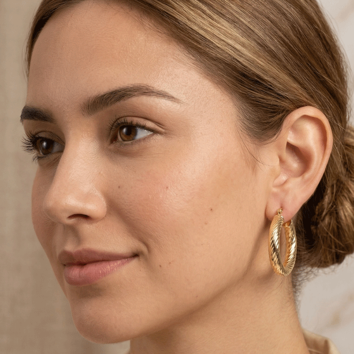 Argollas medianas bañadas en oro con acabado texturizado tipo cordón. Ligeras y con cierre de presión seguro, son la elección perfecta para quienes buscan un básico elevado que aporte volumen y luminosidad al rostro.