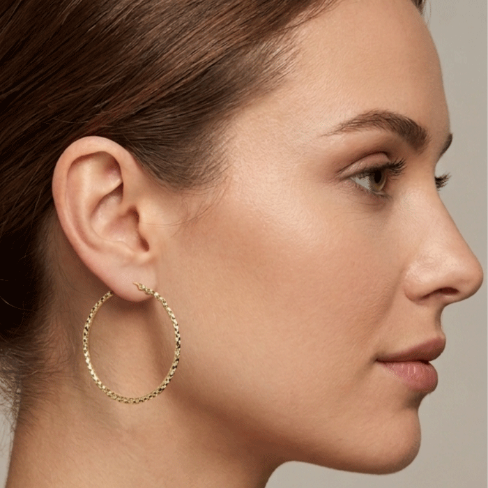 Nuestras argollas de diseño artesanal combinan la elegancia del oro con una técnica de tallado diamantado que crea un efecto visual deslumbrante.