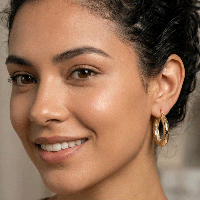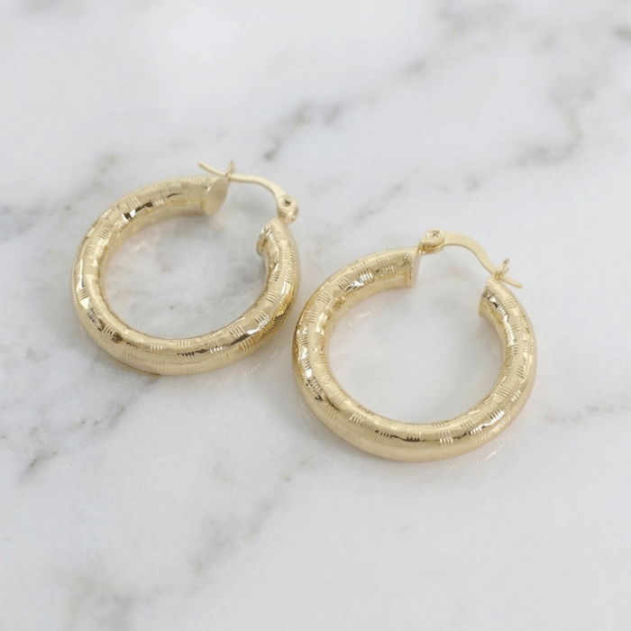Eleva tu estilo con estas sofisticadas argollas bañadas en oro. Su diseño tubular destaca por un delicado grabado texturizado que captura la luz desde cualquier ángulo, ofreciendo un brillo superior al de las argollas lisas tradicionales.