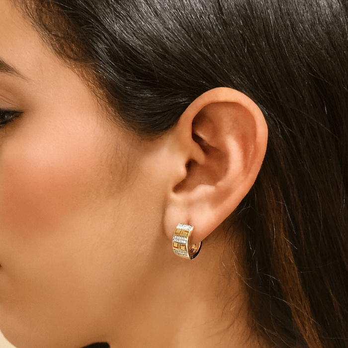 Argollas Huggies con Diseño Geométrico y Circones Bañadas en Oro