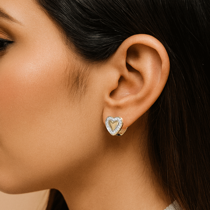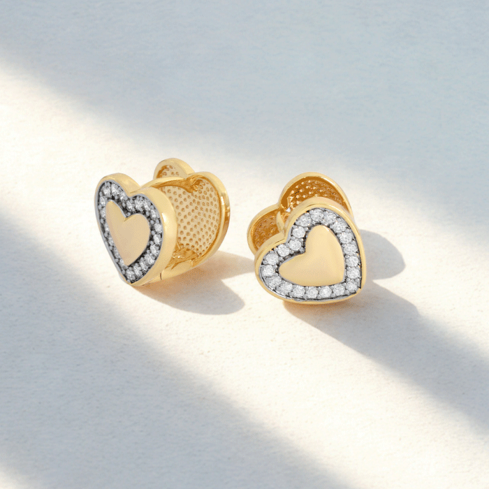 Argollas Huggies en forma de corazón bañadas en oro, con detalles de circones brillantes que aportan elegancia y feminidad.