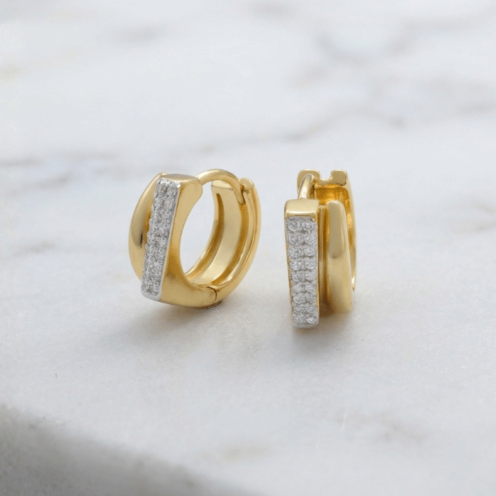 Argollas pequeñas bañadas en oro con diseño ergonómico y barra central de circones. Un accesorio versátil, ligero y brillante, perfecto para usar solas o en combinación con otros pendientes.