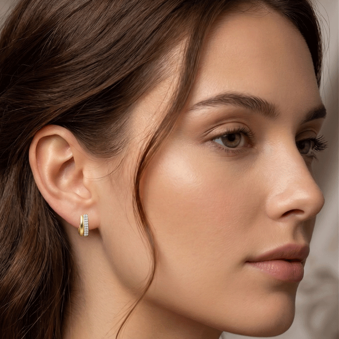 Sofisticadas argollas tipo Huggies con baño de oro, destacadas por una elegante barra frontal adornada con micro-pavé de circones brillantes. Su diseño de doble carril fusiona el minimalismo moderno con un toque de lujo clásico, ideal para elevar cualquier atuendo diario.