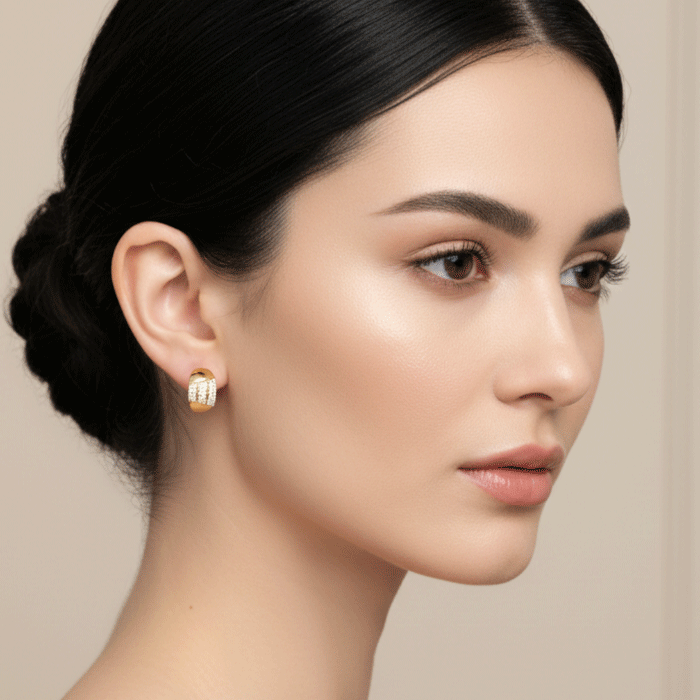 Las Argollas Huggies Glamour Dorado combinan el encanto del diseño moderno con el brillo atemporal del oro. Su forma compacta y elegante se realza con una doble fila de circones engastados con precisión, reflejando la luz con un destello sutil y refinado.