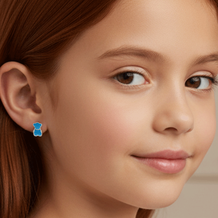 Argollas Huggies para niñas bañadas en plata con diseño de osito azul. Cómodas, seguras y perfectas para el uso diario.