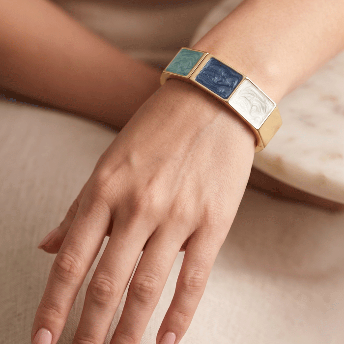 Eleva tu estilo con este brazalete tipo «bangle» que combina la solidez del diseño geométrico con la delicadeza del arte esmaltado. Fabricado con un baño de oro de alto brillo, la pieza presenta estaciones rectangulares con acabados en esmalte que recrean la textura del mármol, ofreciendo una paleta de colores fríos muy sofisticada.