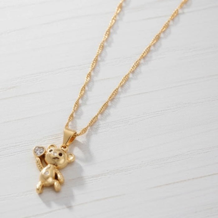 Elegante cadena bañada en oro con un adorable dije de osito sosteniendo un corazón con una circón brillante. Cadena tipo trenzado (torsal). El detalle perfecto para un look dulce y sofisticado.