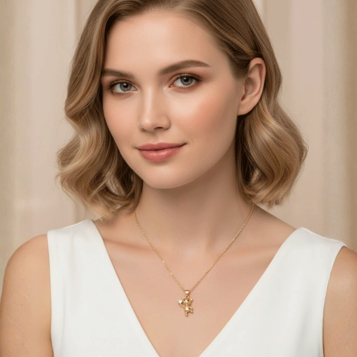 ¡Un toque de ternura y lujo en tu cuello! Esta encantadora cadena con dije de osito es la joya perfecta para añadir un detalle dulce y elegante a tu estilo. El dije presenta la figura de un tierno osito con un acabado pulido y brillante, sosteniendo un corazón adornado con una deslumbrante circón.