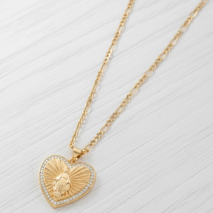 Esta magnífica cadena combina la devoción atemporal del Sagrado Corazón de Jesús con la elegancia moderna de la joyería contemporánea. El dije, con forma de corazón, presenta la figura clásica del Sagrado Corazón rodeada de un espectacular sol de rayos.