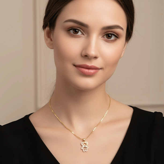 Cadena bañada en oro con dije de osito brillante. Una joya tierna y elegante que ilumina tu estilo.