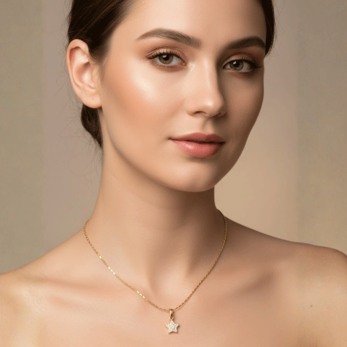 Cadena bañada en oro con dije de estrella brillante. Una joya sutil y elegante que simboliza luz, sueños y estilo.