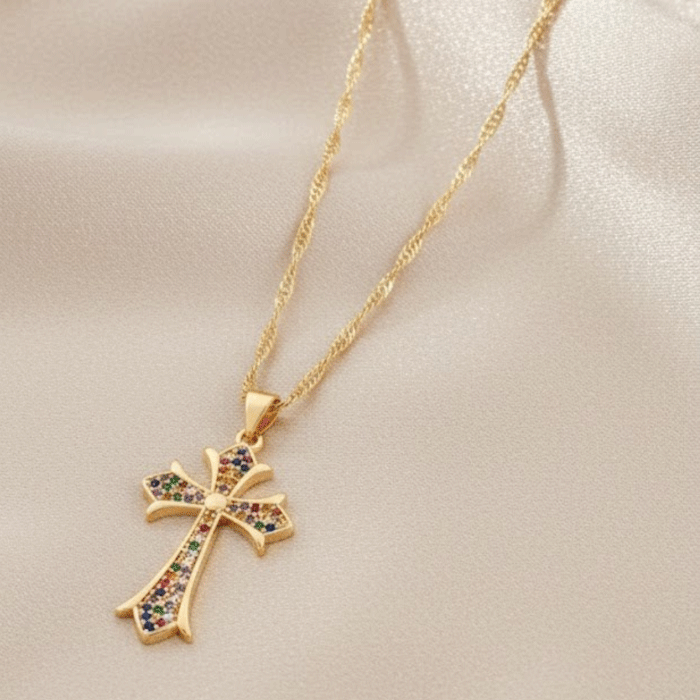 Elegante Cadena con Dije de Cruz Gótica Bañada en Oro. La cruz está bellamente engastada con circones multicolor brillantes que le dan un toque moderno y vibrante. Joyería fina, perfecta para expresar tu fe con estilo.
