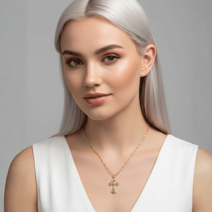 Eleva tu estilo y expresa tu fe con esta exquisita cadena y dije de cruz gótica, una pieza que combina elegancia atemporal y un toque moderno de color. El dije presenta un diseño intrincado con un baño de oro de alta calidad que le confiere un brillo duradero y un aspecto lujoso.
