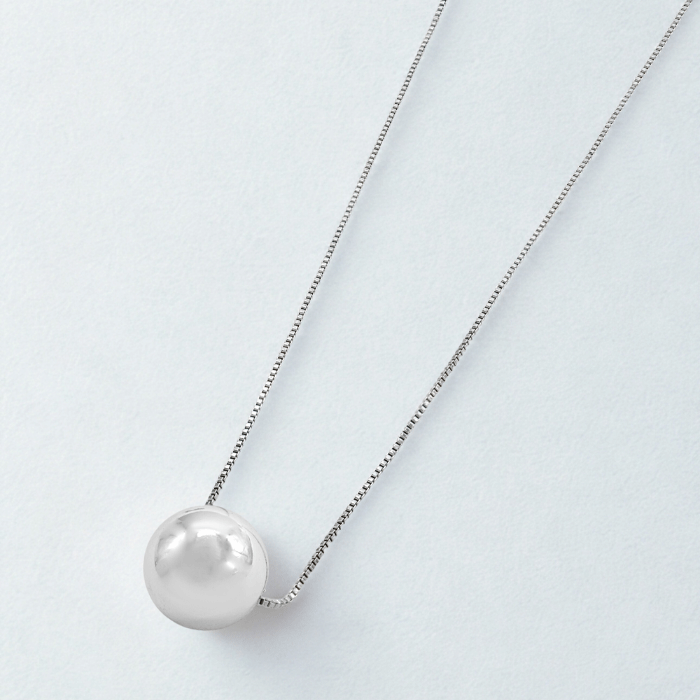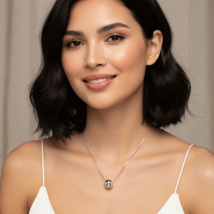 Collar bañado en plata con dije esférico inflado. Un diseño minimalista que refleja elegancia, pureza y estilo moderno.