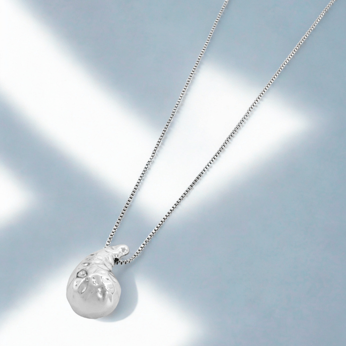 Collar bañado en plata con dije en forma de gota inflada. Su acabado brillante y diseño minimalista proyectan elegancia y modernidad.