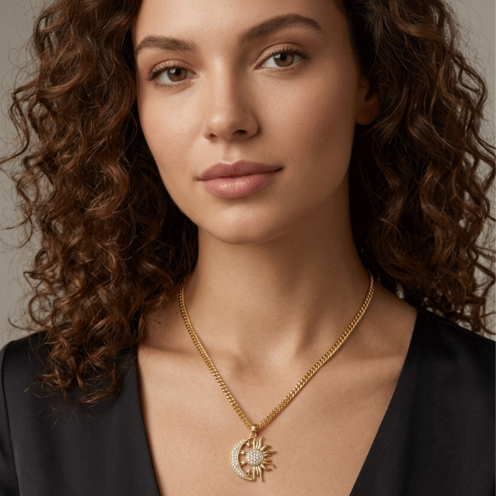 Lleva contigo la magia del cosmos. Este collar bañado en oro combina el misticismo de la luna con la energía del sol en un diseño brillante y detallado.