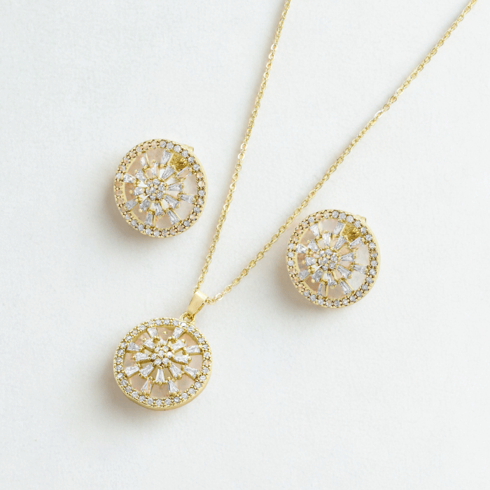 Juego de cadena, dije y aretes bañados en oro con diseño circular de circones brillantes, símbolo de elegancia y estilo.