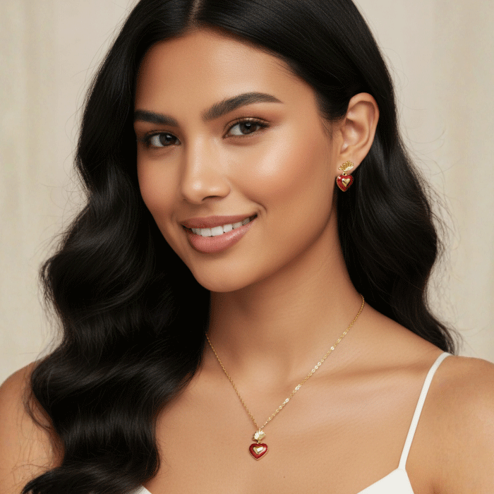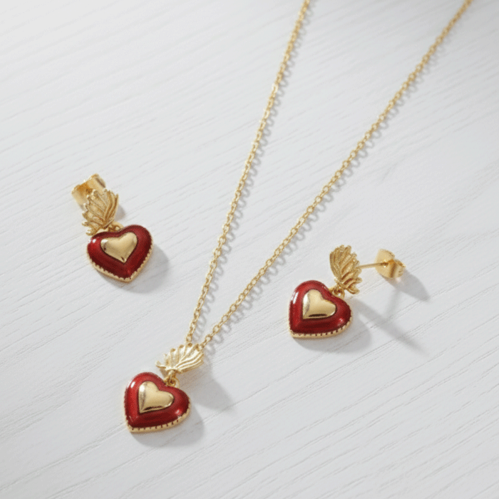Este hermoso juego de cadena, dije y aretes bañados en oro presenta un delicado diseño de corazón esmaltado en color rojo, acompañado de finos detalles en forma de alas que simbolizan amor, libertad y protección. Su acabado brillante y su estilo romántico lo convierten en la joya perfecta para expresar sentimientos especiales y darle un toque emotivo a cualquier look.
