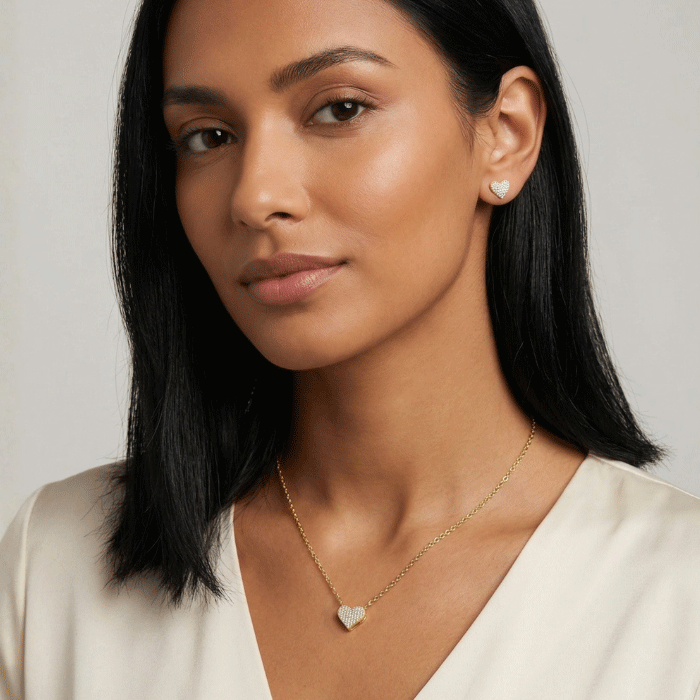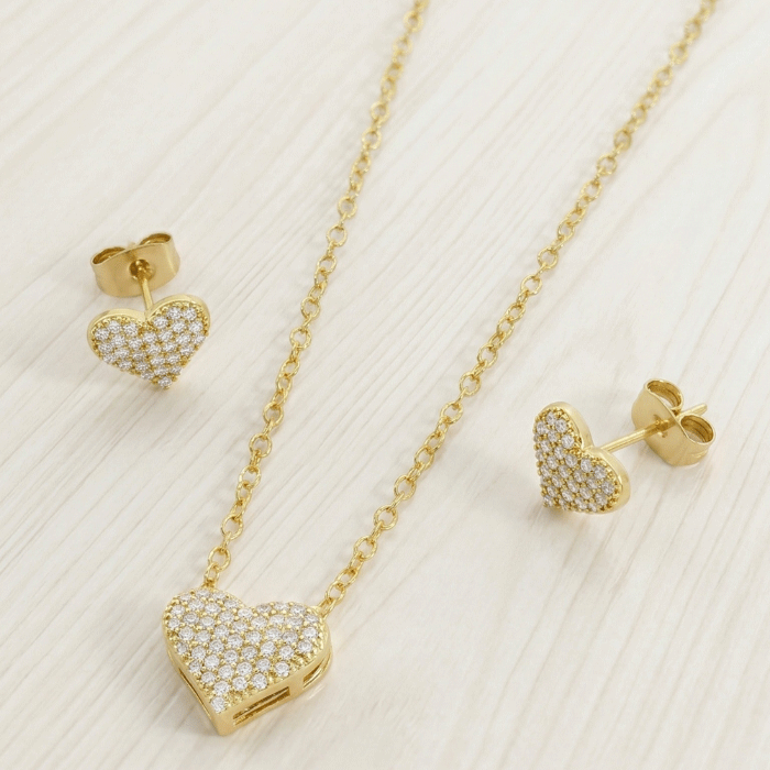 Eleva tu estilo con este sofisticado conjunto de joyería. Presenta un diseño atemporal de corazones meticulosamente decorados con micro-circones que capturan la luz desde cualquier ángulo.