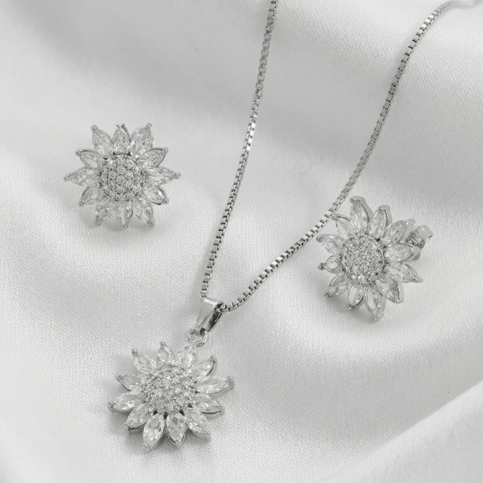 Elegante set de joyería bañado en plata con diseño floral de girasol y circones brillantes. Incluye cadena veneciana, dije y aretes, ideal para ocasiones especiales o un regalo inolvidable.