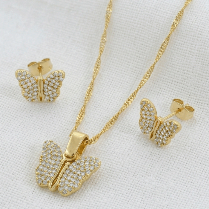 Delicado set de joyería bañado en oro con diseño de mariposa y circones en micro-pavé. Incluye cadena Singapur, dije y aretes a presión; el detalle romántico perfecto para cualquier ocasión.