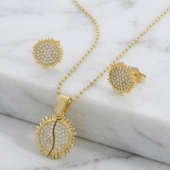 Moderno set de joyería bañado en oro con diseño de sol y micro-pavé de circones. Incluye cadena de esferas, dije y aretes a presión, perfecto para un look luminoso y contemporáneo.
