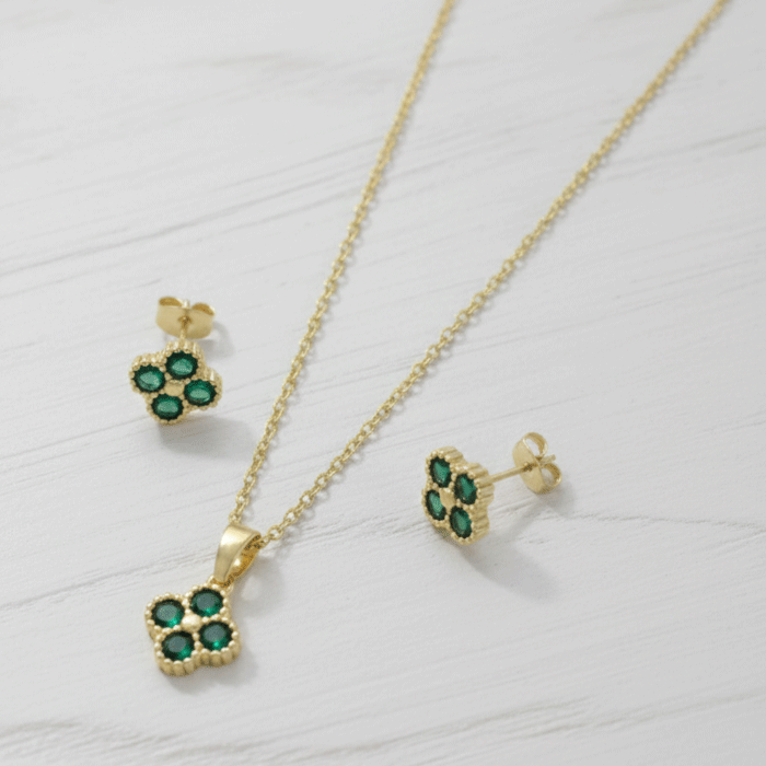 Juego de cadena, dije y aretes bañados en oro con diseño trébol y cristales verdes. Elegante, fresco y lleno de estilo.