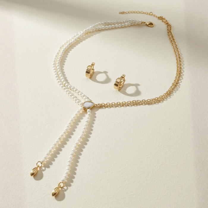 El Juego Elegancia Dorada combina la delicadeza de las perlas con el brillo sofisticado del oro, creando una joya que transmite distinción y feminidad.