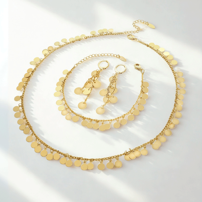 Descubre la elegancia y movimiento de nuestro juego de joyas bañado en oro, compuesto por collar, pulsera y aretes con delicados dijes circulares que reflejan la luz a cada paso. Su diseño moderno y versátil lo convierte en el complemento ideal para realzar cualquier look, desde los más casuales hasta los más sofisticados.