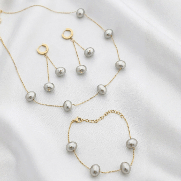Juego de Collar, Pulsera y Aretes con Perlas Grises en Baño de Oro