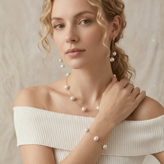 Eleva tu estilo con este exclusivo set de joyería que fusiona la calidez del oro con la modernidad de las perlas grises. El collar y la pulsera presentan una delicada cadena que resalta la forma orgánica de las perlas, mientras que los aretes de caída larga aportan un movimiento elegante y contemporáneo.