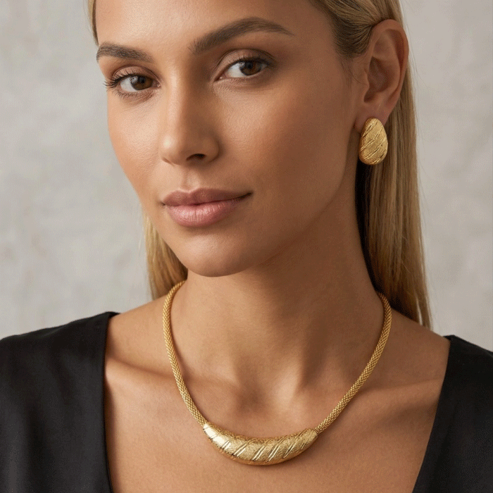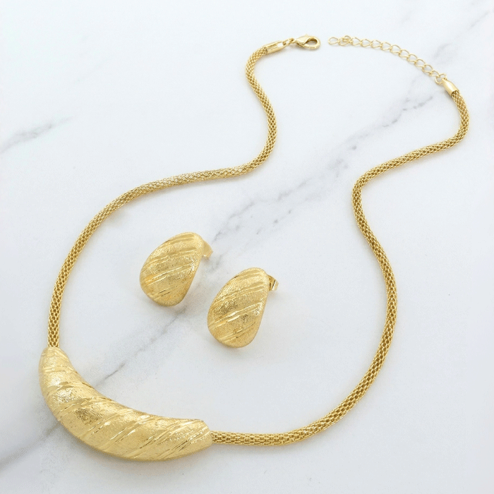 Set de collar tipo malla y aretes de gota con acabado texturizado en baño de oro. Un diseño de alta gama, ideal para eventos especiales o un look ejecutivo sofisticado.