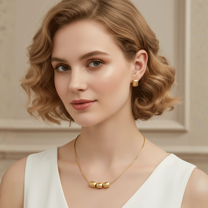 El Juego Esencia Dorada captura la belleza de lo simple con un diseño moderno y refinado. Su collar presenta tres cuentas lisas bañadas en oro que brillan con un acabado pulido espejo, acompañadas de unos aretes tipo topo a juego, creando una armonía perfecta entre minimalismo y elegancia.