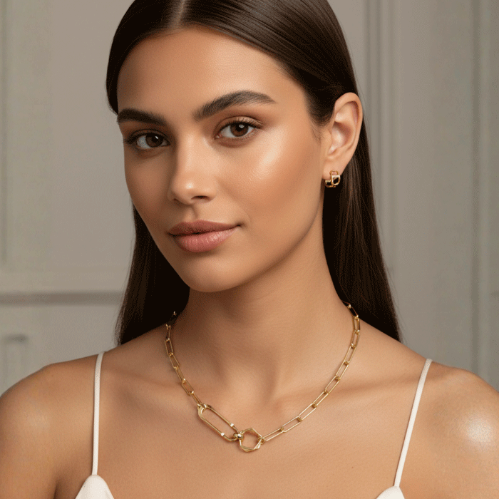 Juego de collar y argollas Huggies bañados en oro con diseño de eslabones modernos. Brillo y elegancia que nunca pasan de moda.