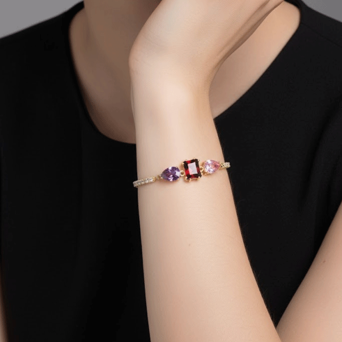 La Pulsera Ajustable con Piedras de Colores Bañada en Oro es una joya que combina elegancia y energía. Su diseño presenta tres piedras centrales en tonos amatista, rubí y rosa cuarzo, que simbolizan armonía, pasión y amor.