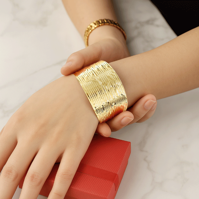 Pulsera ancha bañada en oro con textura martillada. Elegancia audaz y brillo artesanal para destacar tu estilo.