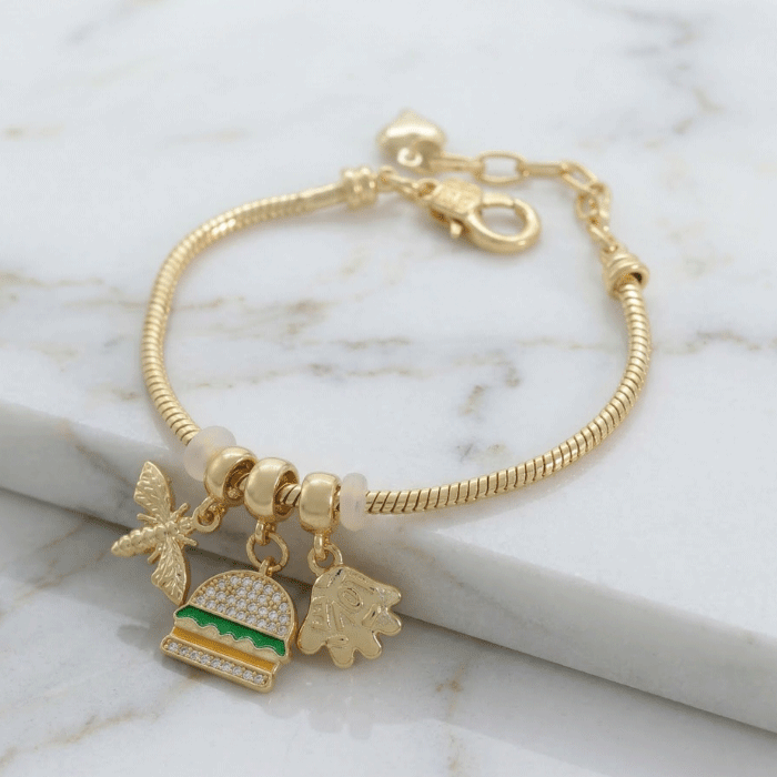 Pulsera Bañada en Oro con Dijes de Abeja, Hamburguesa y Mano de Fátima