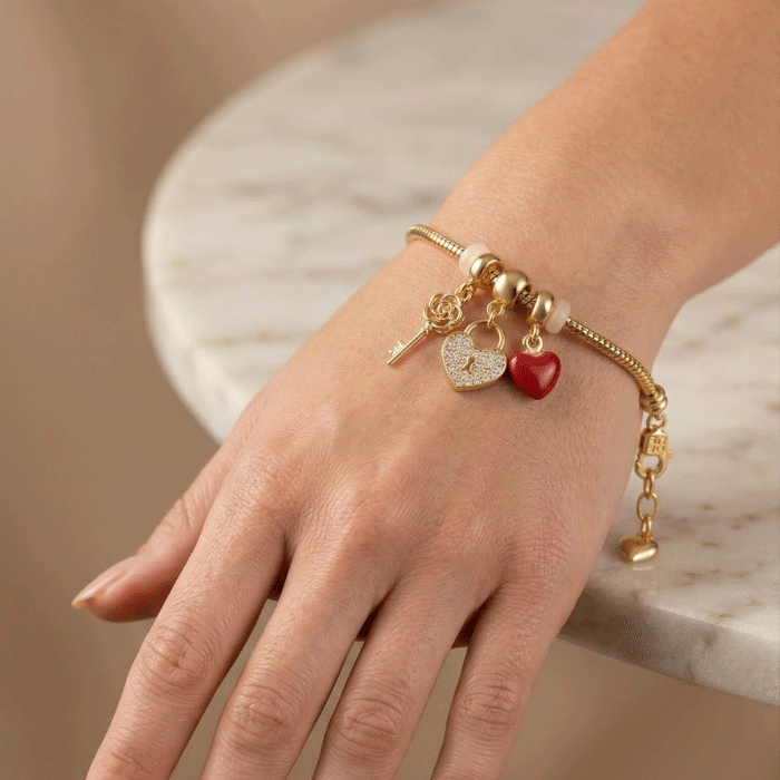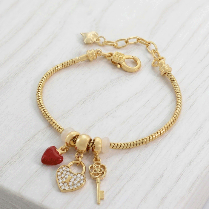 Elegante pulsera tipo «snake chain» con acabado en oro de 18k. Este diseño destaca por su trío de dijes colgantes: un corazón rojo vibrante, un candado de corazón con incrustaciones de cristales y una llave detallada con una rosa.