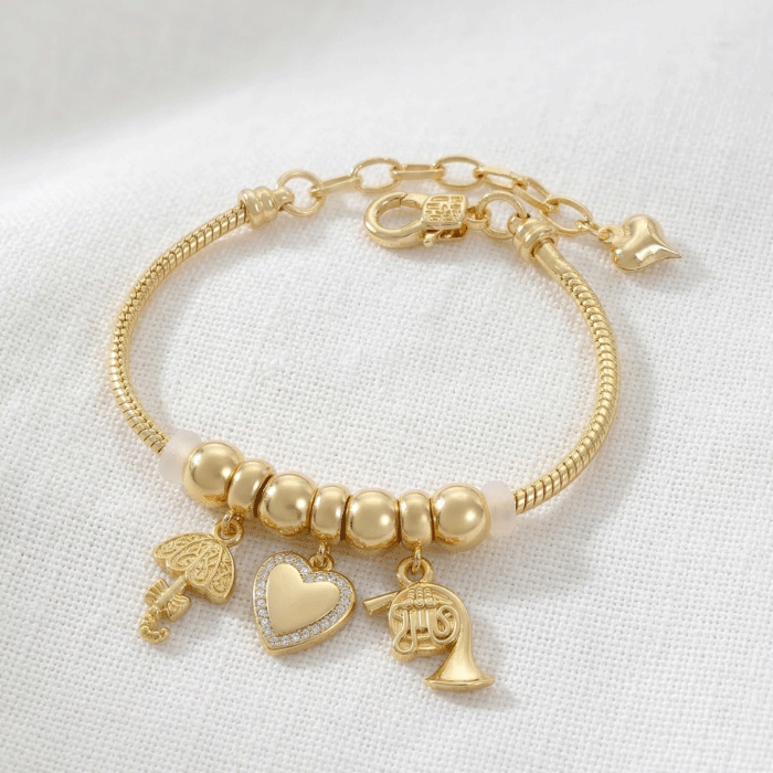 Añade un toque de encanto y sofisticación a tu muñeca con nuestra pulsera bañada en oro. Con un diseño de cadena tipo «snake» y tres dijes colgantes —un corazón con micro-pavé, un paraguas detallado y una trompeta — esta pieza es el equilibrio perfecto entre estilo lúdico y elegancia clásica. Ideal para regalo o para llevar un significado especial contigo.
