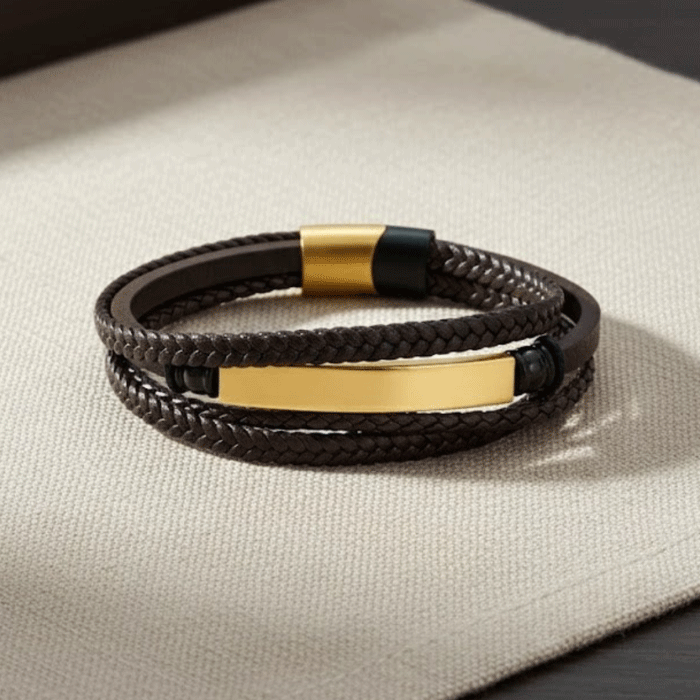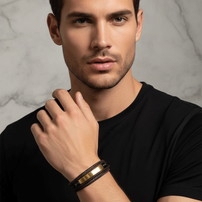 La Pulsera de Cuero Trenzado y Acero Inoxidable Dorado es el accesorio definitivo para el hombre moderno que valora la sofisticación y la robustez.