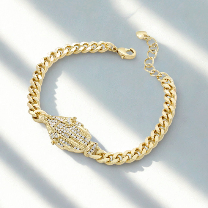 Pulsera de cadena cubana con dije de Virgen orante y circones, bañada en oro. Elegancia y fe en una sola joya.