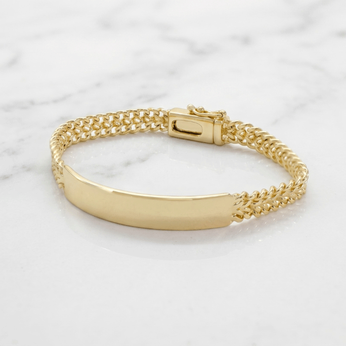Un toque de sofisticación atemporal. Esta pulsera esclava con acabado en baño de oro presenta una placa central pulida y lisa, perfecta para grabar un nombre, fecha o mensaje especial. Su diseño se completa con una elegante cadena de malla Franco que se adapta cómodamente a la muñeca.