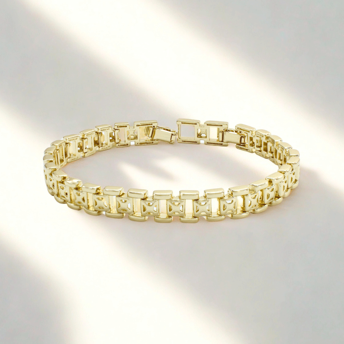 Pulsera bañada en oro con diseño geométrico de eslabones rectangulares. Un toque de modernidad y elegancia para tu estilo.